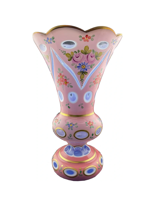Hand blown glass, light blue with a layer of milk white glass on top and in the case of this vase, another layer of pink. Hand cutting through the outer layers, enamel flowers and gold trim complete the design. The majority production of this type of glass ceased in 2004 but we still have some from some extensive buying at that time.