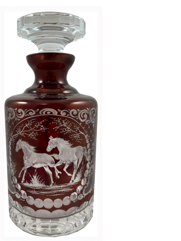 A process developed in the first half of the 1800's that stained a thin outer layer of glass red then hand engraved. This particular decanter was one of the last shipped out of the Egermann factory before they closed November 2022